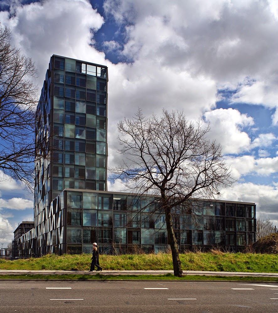 Die Stadtgrenzen Amsterdams sind erreicht, Bauplätze für neue Wohnungen sind knapp. Was übrig bleibt, sind jene Orte, an denen mit komplexen Randbedingungen wie hoher Lärmbelastung, Sicherheitsproblemen oder großer Luftverschmutzung zu rechnen ist. Het Kasteel steht gleich neben dem Rangierareal des Eisenbahnbetreibers ProRail, wodurch auch ein vom Gebäude unabhängiger Lärmschutz verlangt wurde. Um nicht eine für Bürohäuser oft typische Doppelfassade entwerfen zu müssen, begann die Suche nach einer markanten und mit einem Wohnbau zu vereinbarenden Fassadenlösung. Der Komplex wurde somit an der Außenseite mit Glaspaneelen eingehaust, die in einem stets anderen Winkel zueinander stehen und dem Bau den Charakter eines riesigen Kristalls verleihen. Die Wechselwirkung zwischen Wohnhausfassade und vorgesetzter, dynamischer Glashaut lässt das Gebäude zu einer Ikone des Science Parks werden.