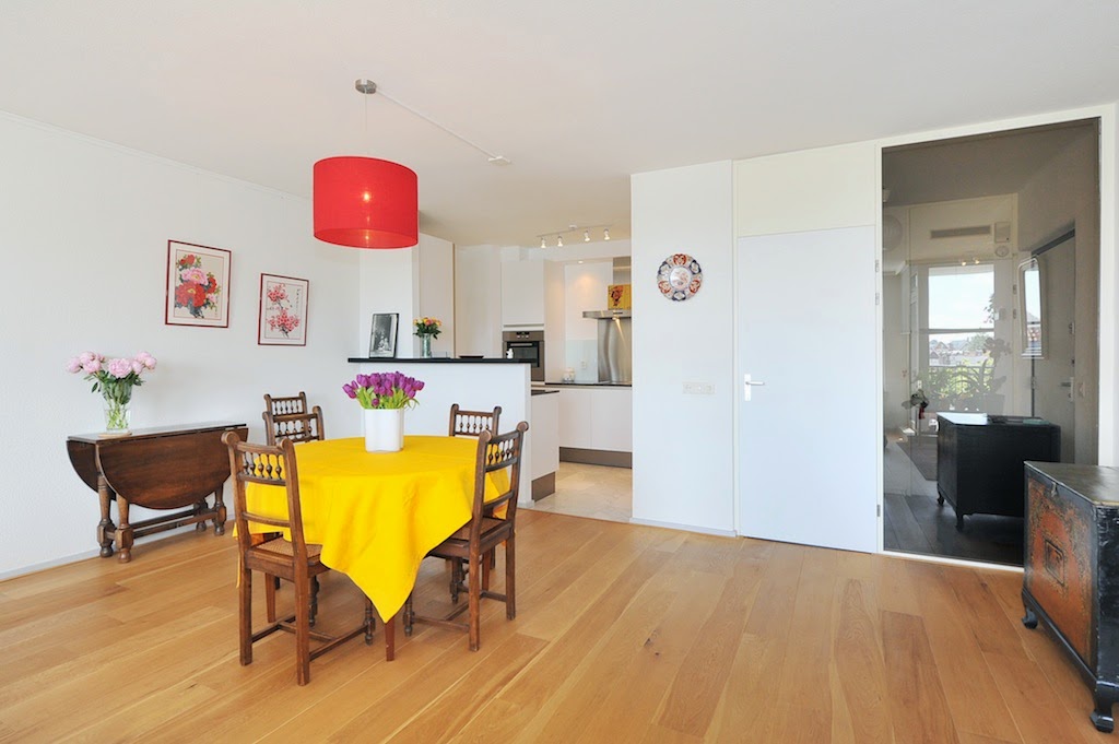 In this apartment in the North of Rotterdam, the demising wall between the dining room and the kitchen was demolished in order to create a new space for cooking, eating and working with a central kitchen island. [...]